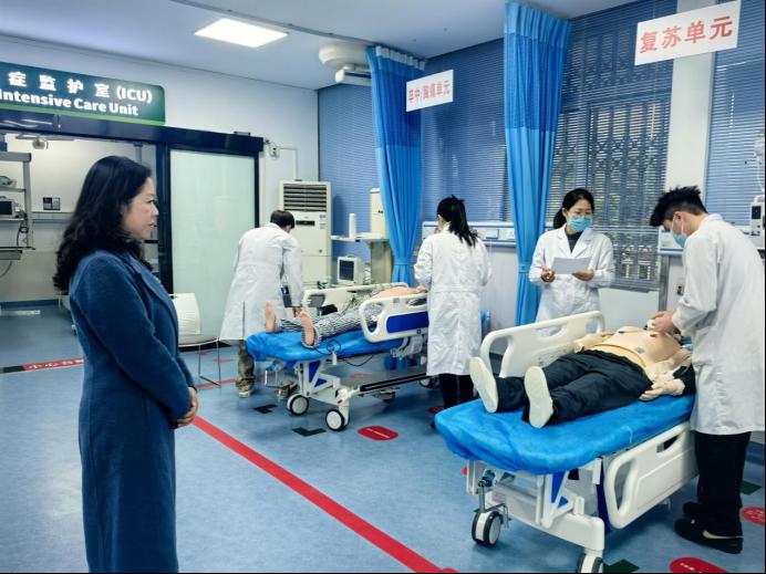 考核期间,护理学院唐万珍与张敏陪同考核组一行,实地走访综合护理实训基地、虚拟仿真实训室、老年人健康技术推广中心等教学场所,详细介绍了数字模拟人、虚实结合训练系统、远程实景互动教学平台等实训教学资源的建设与应用。考核组对实训基地的建设成效给予高度评价,并表示相关经验为其今后实训室建设提供了有益参考。此外,双方护理专业教师围绕教学开展深入交流,进一步凝聚了军士培养的合作共识。